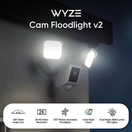 Wired Outdoor Wi-Fi Floodlight V2 Home Security Camera with 2K Video, Color Night Vision, Motion Activated Leds - White